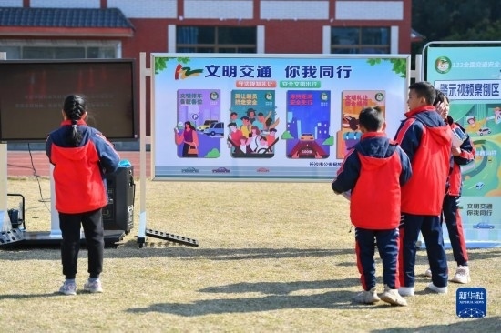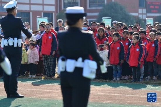 12月1日,在長沙市望城區(qū)新河學(xué)校,學(xué)生觀看交警手勢演示。