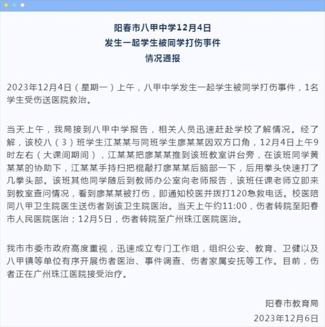 ·廣東陽春一中學(xué)生疑被同學(xué)打成植物人?官方通報(bào):成立專門工作組。