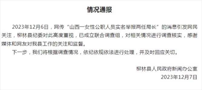 ·山西女子實(shí)名舉報(bào)兩任局長受賄玩弄女性,柳林縣紀(jì)委:已經(jīng)成立聯(lián)合調(diào)查組。