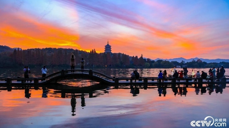 夕陽西下,在杭州西湖景區(qū),晚霞染紅了天空和水面,與遠(yuǎn)處的雷峰塔構(gòu)成了一幅美麗的畫卷,吸引游客拍照打卡。
