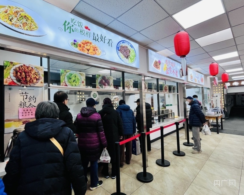 天津市和平區(qū)南營(yíng)門街道老人家食堂內(nèi),老人們排隊(duì)就餐(央廣網(wǎng)記者 褚夫晴 攝)