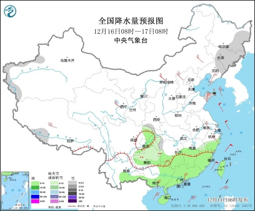12月15日08時(shí)至16日08時(shí),西北地區(qū)東南部、內(nèi)蒙古東部、東北地區(qū)中南部、華北南部、黃淮、江淮西部、江漢大部、川西高原北部、四川盆地北部、貴州西部等地部分地區(qū)有小到中雪或雨夾雪,其中,吉林東部、遼寧東北部、山東半島北部等地部分地區(qū)有大到暴雪(10~11毫米)。貴州等地局地有凍雨。江淮東部、江南東部、福建大部、廣東北部等地部分地區(qū)有中到大雨(25~40毫米)。西北地區(qū)東部、內(nèi)蒙古中東部、吉林、遼寧、華北、黃淮北部和西部、江漢東部、江南北部和東部、華南沿海地區(qū)等地部分地區(qū)有4~6級(jí)風(fēng)(見圖6)。