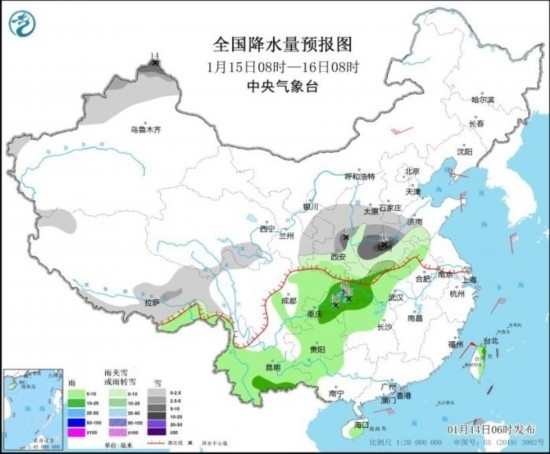 1月15日08時(shí)至16日08時(shí),新疆西北部、西藏東部和南部、青海東南部、西北地區(qū)東部、華北南部、黃淮中西部等地部分地區(qū)有小到中雪或雨夾雪,其中,新疆西北部、陜西中部、山西南部、河南中北部等地部分地區(qū)有大雪或暴雪(10~14毫米)。安徽北部、湖北中西部、湖南西北部、貴州、云南大部、廣西西北部等地部分地區(qū)有小到中雨,其中,湖北西南部、重慶東部等地局地有大雨(25~40毫米)。內(nèi)蒙古中部、遼東半島、山東半島等地部分地區(qū)有4~5級(jí)風(fēng)。臺(tái)灣海峽、南海東北部海域?qū)⒂?~7級(jí)風(fēng)、陣風(fēng)8~9級(jí)。