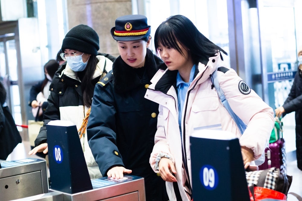 北京西站客運員協(xié)助旅客檢票進站。新華社發(fā)(徐強攝)