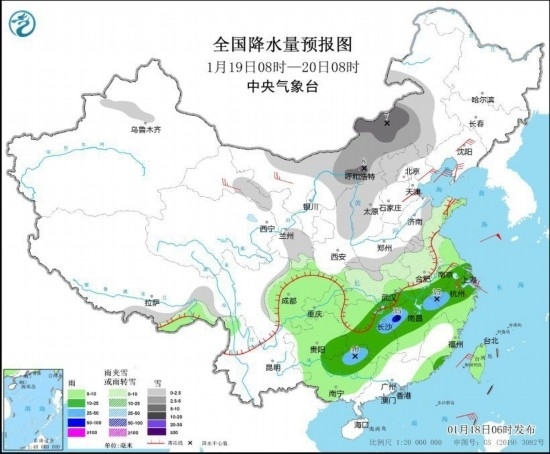 1月19日08時至20日08時,新疆沿天山地區(qū)、甘肅南部和河西地區(qū)、陜西北部、內(nèi)蒙古中西部和東南部、山西大部、河北西北部、山東東部、河南南部、蘇皖中北部、湖北北部等地部分地區(qū)有小到中雪或雨夾雪,局地有大雪。江南中北部和西部、西南地區(qū)東南部、華南北部等地部分地區(qū)有中到大雨,其中,湖南東北部、江西西北部等地部分地區(qū)有暴雨(50~55毫米)。甘肅河西、內(nèi)蒙古西部、遼寧大部、華北東部、山東半島、江南東部等地部分地區(qū)有4~6級風(fēng)(見圖2)。