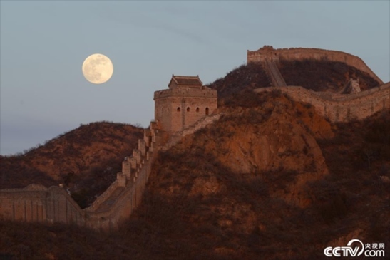 2024年1月25日,農(nóng)歷臘月十五,河北承德,傍晚時(shí)分,圓月映襯下的金山嶺長城,唯美壯觀。