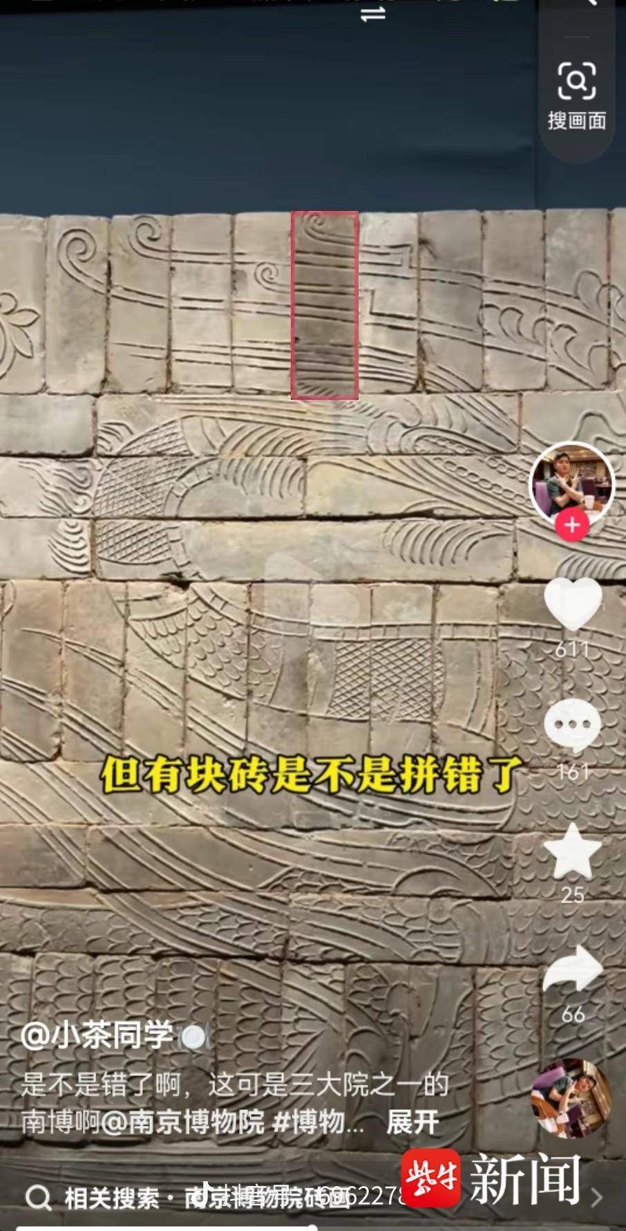 “家人們,我好像在南博發(fā)現(xiàn)了一件展品有一處錯(cuò)誤”,網(wǎng)友“小茶同學(xué)”發(fā)視頻表示,“1月25日去南京博物院游覽,在看到《羽人戲龍磚畫(huà)》時(shí),發(fā)現(xiàn)磚畫(huà)很精美,保留很完整。磚畫(huà)上的陽(yáng)刻線條尤其讓我感到震撼,看到深色磚的部分,我感覺(jué)有點(diǎn)別扭,當(dāng)時(shí)就臆想著那塊磚反過(guò)來(lái)是不是更好一點(diǎn),于是發(fā)了一個(gè)視頻求助?!?/p>