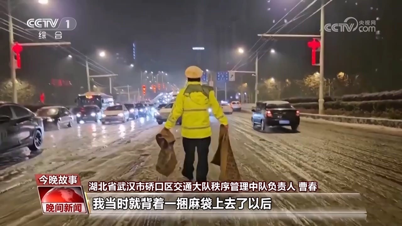 武漢市硚口區(qū)交通大隊(duì)秩序管理中隊(duì)負(fù)責(zé)人 曹春:上橋的路車輛上不去,車輪打滑,我當(dāng)時(shí)就背著一捆麻袋上去以后,在前面幾輛車車輪下墊著麻袋,從上橋處到橋面大概三百多米的距離,一輛一輛車往上推,推了以后再推下一輛。