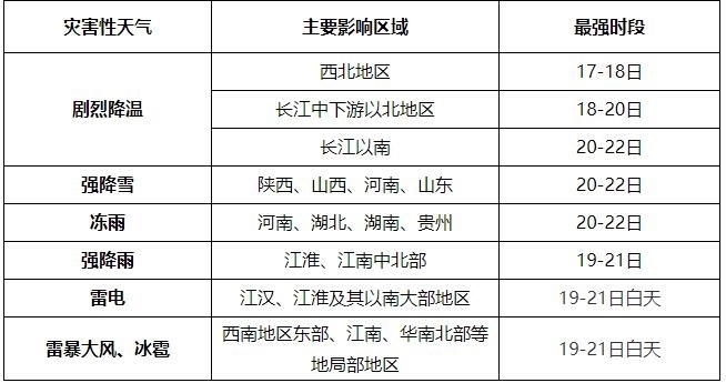 央視網(wǎng)消息:中央氣象臺(tái)預(yù)計(jì),2月17日至22日寒潮天氣將影響我國,中東部地區(qū)氣溫起伏劇烈,大部地區(qū)降溫10~18℃,局地氣溫降幅可達(dá)20℃以上;全國大部有明顯雨雪天氣,其中陜西、山西、河南、山東等地有暴雪,局地大暴雪;河南、湖北、湖南、貴州將先后出現(xiàn)凍雨;江淮、江南中北部局地有暴雨,南方地區(qū)有大范圍雷電和局地強(qiáng)對(duì)流天氣。