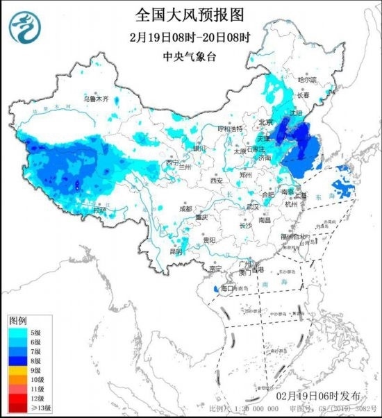 中央氣象臺2月19日6時繼續(xù)發(fā)布大風(fēng)藍色預(yù)警:預(yù)計,2月19日8時至20日8時,西藏中西部、青海中南部、內(nèi)蒙古東南部、遼寧西部和南部、華北東部、黃淮東部、江淮東部等地的部分地區(qū)有5~6級風(fēng),陣風(fēng)7~9級。渤海、渤海海峽、黃海大部海域?qū)⒂?~8級風(fēng),陣風(fēng)9~10級。