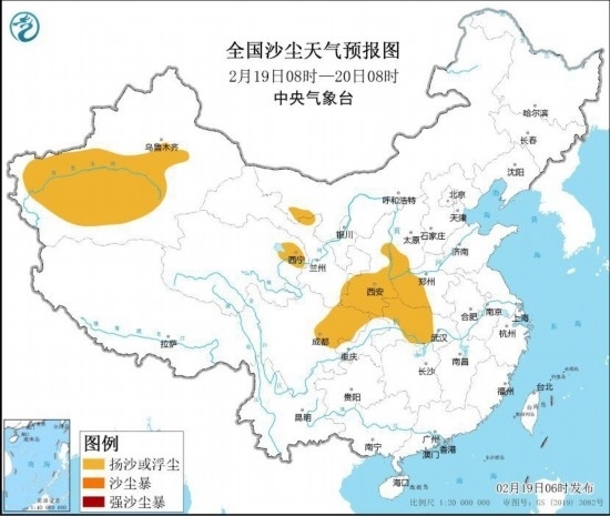 中央氣象臺2月19日6時繼續(xù)發(fā)布沙塵暴藍色預(yù)警:預(yù)計2月19日8時至20日8時,新疆南疆盆地、內(nèi)蒙古西部、青海東北部、陜西中南部、山西西南部、河南西部、湖北中西部、四川盆地中北部等地的部分地區(qū)有揚沙或浮塵天氣。
