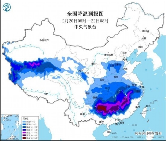 預(yù)計(jì),2月20日8時(shí)至2月22日8時(shí),華北南部、黃淮西部、江淮西部、江漢、江南中北部、貴州東部、廣西北部等地的部分地區(qū)將先后降溫8~10℃,其中,江漢、江南中西部、貴州東部等地將降溫12℃~14℃,湖南南部、江西南部、貴州東部、廣西北部等地的部分地區(qū)降溫可達(dá)16℃以上。