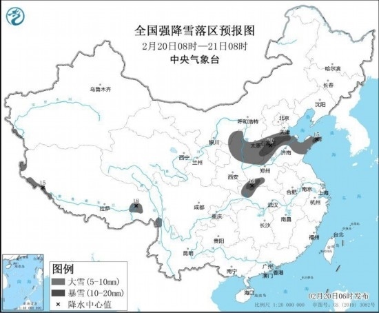 預(yù)計(jì)2月20日08時(shí)至2月21日08時(shí),陜西北部、山西中南部、河北中南部、山東中東部和北部、河南北部和西南部、湖北西北部、西藏西部和東南部等地的部分地區(qū)有大雪,其中,山西東南部、河北南部、山東西北部和東部、河南西南部、湖北西北部等地的部分地區(qū)有暴雪(10~19毫米)。上述部分地區(qū)新增積雪深度3~7厘米,局地可達(dá)10厘米以上。