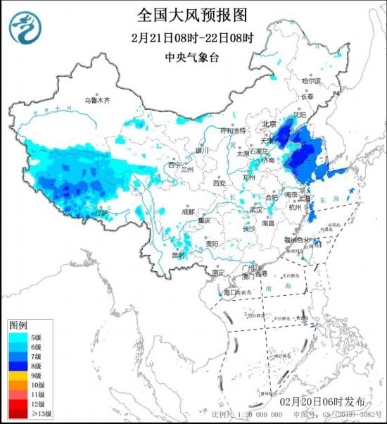 預(yù)計(jì),2月20日8時(shí)至21日8時(shí),西藏中西部、青海中南部、內(nèi)蒙古中西部、遼寧南部、華北東南部、黃淮西部和東部、江淮西部和北部等地的部分地區(qū)有5~7級(jí)風(fēng),陣風(fēng)8~9級(jí)。渤海、渤海海峽、黃海大部海域?qū)⒂?~8級(jí),陣風(fēng)9~10級(jí)的大風(fēng)。