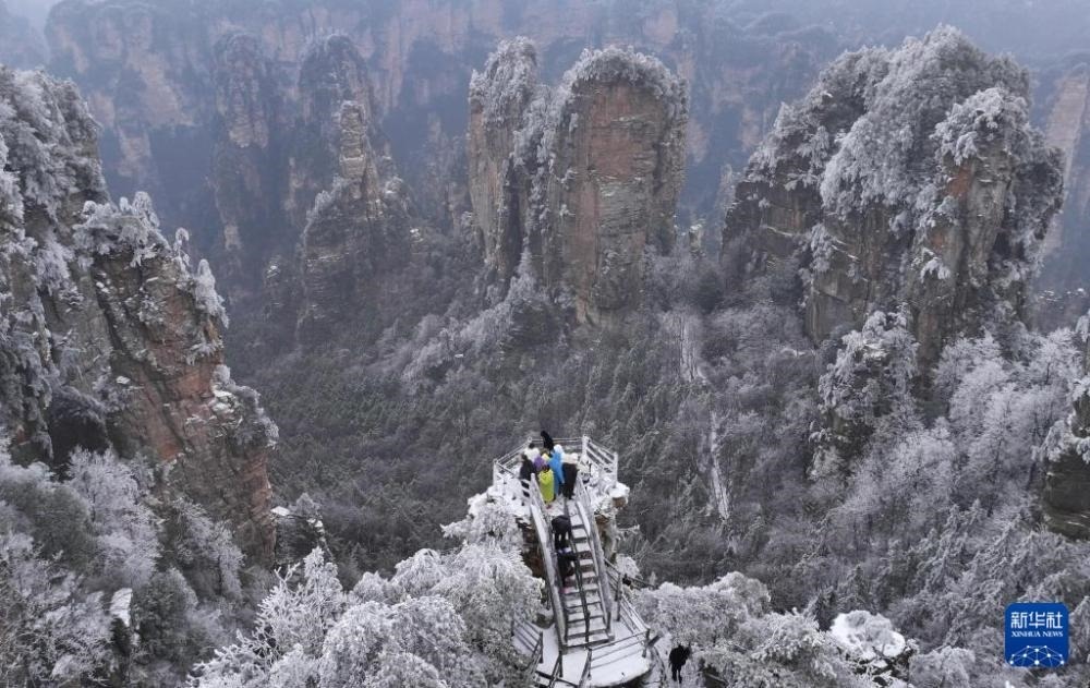 近日,湖南張家界迎來降雪天氣,雪后的張家界國(guó)家森林公園銀裝素裹,美景如畫,引人入勝。
