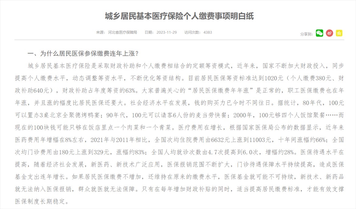 記者注意到,河北省醫(yī)保局去年11月份曾發(fā)布《城鄉(xiāng)居民基本醫(yī)療保險個人繳費事項明白紙》,其中就“為什么居民醫(yī)保參保繳費連年上漲?”問題回應(yīng)稱:“大家普遍關(guān)心的‘居民醫(yī)保繳費年年漲’是正常的,職工醫(yī)保繳費也在年年漲,并且漲的幅度比居民醫(yī)保還要大。社會經(jīng)濟水平在發(fā)展,錢的購買力已今時不同往日,醫(yī)療費用在增長,醫(yī)保待遇水平在提高。如果居民醫(yī)保繳費不增加,還維持在原來的繳費水平,醫(yī)?;鹁涂赡懿豢沙掷m(xù),新技術(shù)、新藥品就無法納入醫(yī)保報銷,群眾就醫(yī)就無法保障。”