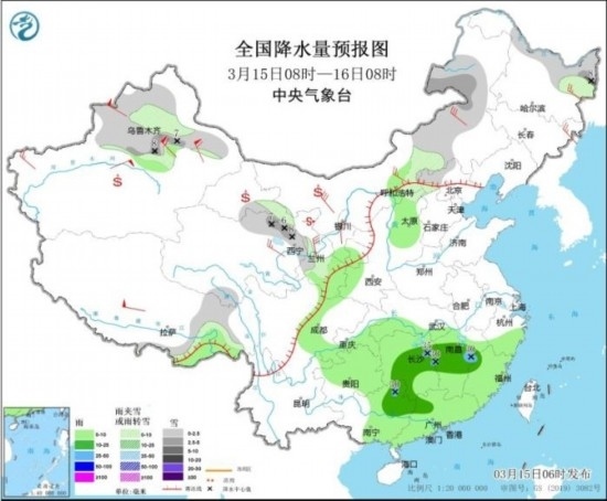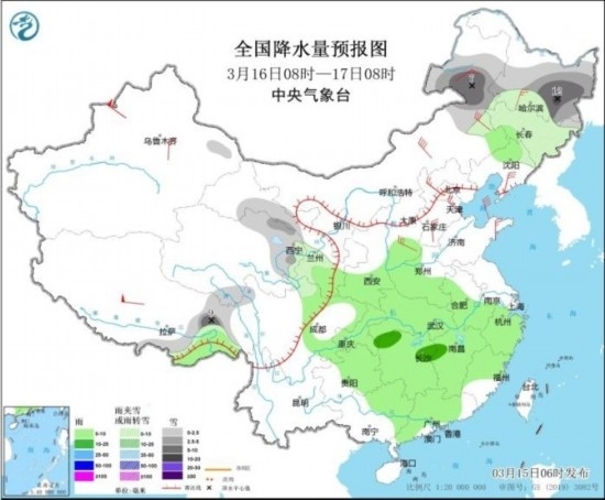 3月15日08時(shí)至16日08時(shí),新疆北部、青海北部、甘肅、內(nèi)蒙古東部、黑龍江北部、河北西北部等地部分地區(qū)有小到中雪或雨夾雪,其中,新疆沿天山地區(qū)、青海東北部、黑龍江東北部等地部分地區(qū)有大雪(5~8毫米)。甘肅南部、寧夏南部、陜西西南部、湖北南部、湖南、江西大部、重慶東部、貴州大部、華南大部等地部分地區(qū)有小到中雨,其中,湖南東北部、江西中部、廣西東北部等地部分地區(qū)有大雨(25~35毫米)。新疆北部、青海東部、甘肅、內(nèi)蒙古大部、黑龍江東部、吉林東部等地部分地區(qū)有4~6級風(fēng),其中,新疆伊犁河谷和沿天山地區(qū)等地有8~9級風(fēng),山口風(fēng)力可達(dá)10~11級。新疆東部和南部、內(nèi)蒙古西部、青海西北部、甘肅中西部、寧夏、陜西北部等地的部分地區(qū)有揚(yáng)沙或浮塵天氣,內(nèi)蒙古西部、甘肅中部局地有沙塵暴。