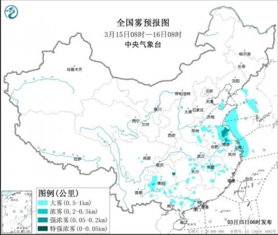 全國霧預(yù)報(bào)圖(3月15日08時(shí)-16日08時(shí))。圖片來源:中央氣象臺網(wǎng)站