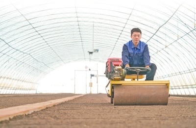 黑龍江北大荒農業(yè)股份有限公司友誼分公司智慧農場育秧大棚里,職工在進行水稻育秧前的地面平整作業(yè)。新華社記者 王 松攝