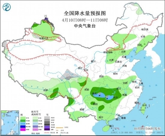 4月9日08時(shí)至10日08時(shí),內(nèi)蒙古東北部、黑龍江西北部、新疆北疆北部和伊犁河谷、西藏北部和西部、青海中部和北部、川西高原北部等地部分地區(qū)有小到中雪或雨夾雪,其中,新疆北疆北部等地局部有大到暴雪(10~18毫米)。新疆北部、內(nèi)蒙古中部、華北北部、西藏中部和東南部、青海東部、甘肅中部和南部、寧夏、陜西北部和西南部、四川盆地大部、重慶、湖北西部、貴州北部、湖南北部、云南西部和東南部、廣西東南部、海南島、臺(tái)灣島等地部分地區(qū)有小到中雨,其中,西藏東南部局地有大雨(25~30毫米)。新疆北疆沿天山地區(qū)、甘肅西部、內(nèi)蒙古西北部、黑龍江東北部、西藏中部等地部分地區(qū)有4~6級(jí)風(fēng)。東海大部海域、臺(tái)灣海峽、臺(tái)灣以東洋面、巴士海峽、南海東北部海域?qū)⒂?~7級(jí)、陣風(fēng)8級(jí)的風(fēng),其中臺(tái)灣海峽的部分海域風(fēng)力可達(dá)8級(jí)、陣風(fēng)9級(jí)。