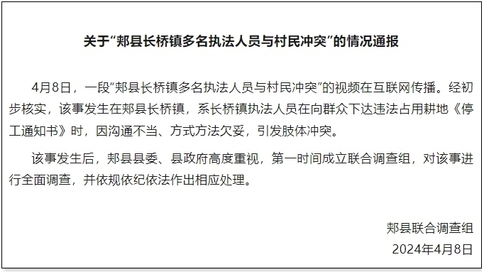 央視網(wǎng)消息:據(jù)“郟縣發(fā)布”公眾號消息,河南省平頂山市郟縣聯(lián)合調(diào)查組發(fā)布情況通報,4月8日,一段“郟縣長橋鎮(zhèn)多名執(zhí)法人員與村民沖突”的視頻在互聯(lián)網(wǎng)傳播。經(jīng)初步核實,該事發(fā)生在郟縣長橋鎮(zhèn),系長橋鎮(zhèn)執(zhí)法人員在向群眾下達(dá)違法占用耕地《停工通知書》時,因溝通不當(dāng)、方式方法欠妥,引發(fā)肢體沖突。