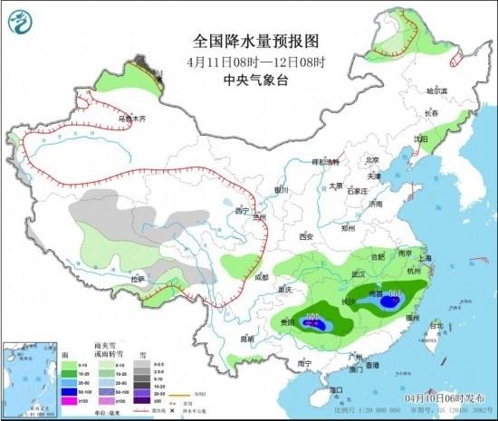 4月11日08時至12日08時,內蒙古東北部、西藏中東部、青海南部、新疆北疆北部等地部分地區(qū)有小到中雪或雨夾雪,其中,新疆北疆北部和北疆東部等地部分地區(qū)有大到暴雪,局地大暴雪(20~24毫米)。貴州東南部、湖南中南部、江西中北部、浙江南部、福建北部、廣西北部等地部分地區(qū)有中到大雨,其中,貴州東南部、湖南西南部、江西東部、福建西北部、廣西東北部等地部分地區(qū)有暴雨或大暴雨(100~180毫米)。內蒙古中部、遼東半島、山東半島、浙江北部等地部分地區(qū)有4~5級風;渤海、渤海海峽、黃海大部海域部分海域將有6~7級、陣風8級的風。