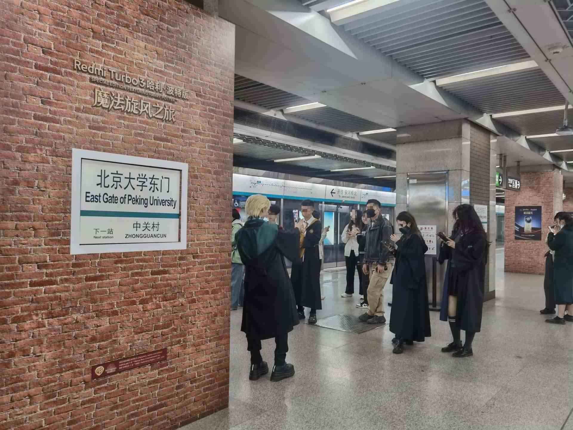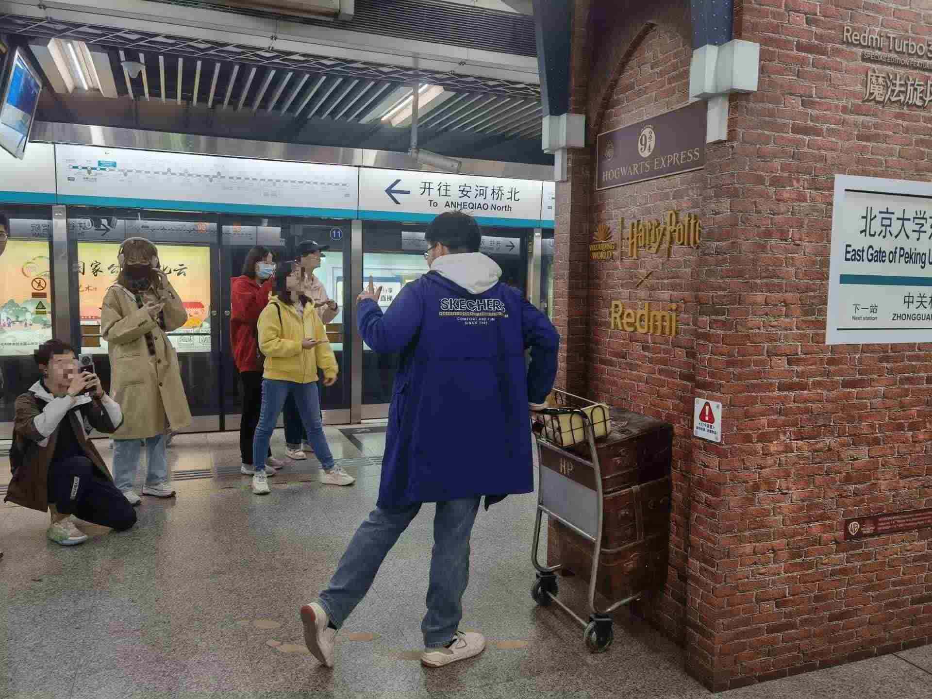 北京大學(xué)東門地鐵站內(nèi),眾多市民打卡拍照哈利·波特站臺(tái)