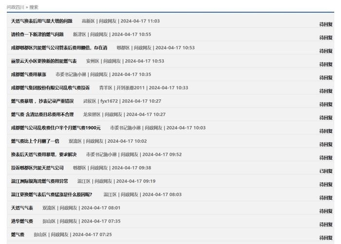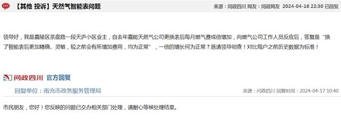 中新網(wǎng)4月17日電(中新財經(jīng)記者 吳濤)近日,在“問政四川”平臺上,不少網(wǎng)友反映“更換新表后燃氣費異常上漲”,這些留言顯示來自四川成都、自貢、廣安、南充等多地,僅僅在4月16日,保守估計就有十幾條;17日上午又出現(xiàn)十幾條。大部分尚未得到回復(fù),部分獲得官方回復(fù)稱“留言已轉(zhuǎn)交給相關(guān)機構(gòu)進行處理”。