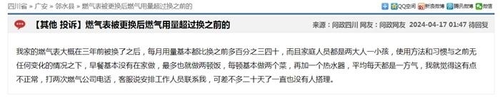 有居民在“問政四川”平臺稱,“自從換新燃氣表后,1年多了,家里人口沒變,做飯次數(shù)沒變,燃氣費每月從50多變成每月100多?!?/p>