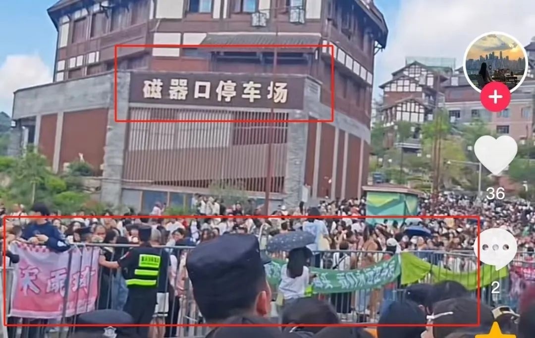 根據(jù)視頻顯示的“磁器口停車場(chǎng)”檢索視頻平臺(tái)相關(guān)內(nèi)容,有不少網(wǎng)友在4月19日發(fā)布了綜藝節(jié)目《奔跑吧》在當(dāng)?shù)劁浿茣r(shí)的畫(huà)面,通過(guò)比對(duì)可以發(fā)現(xiàn),網(wǎng)傳視頻中出現(xiàn)的圍欄、安保分布情況、以及圍欄上懸掛的不同顏色應(yīng)援橫幅等元素都與路人拍攝的清晰版視頻一致。