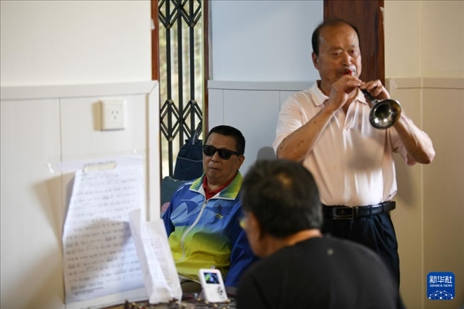 5月6日,張世維(后左)旁聽“自強不息藝術團盲人樂隊”排練曲目。新華社記者 胥冰潔 攝