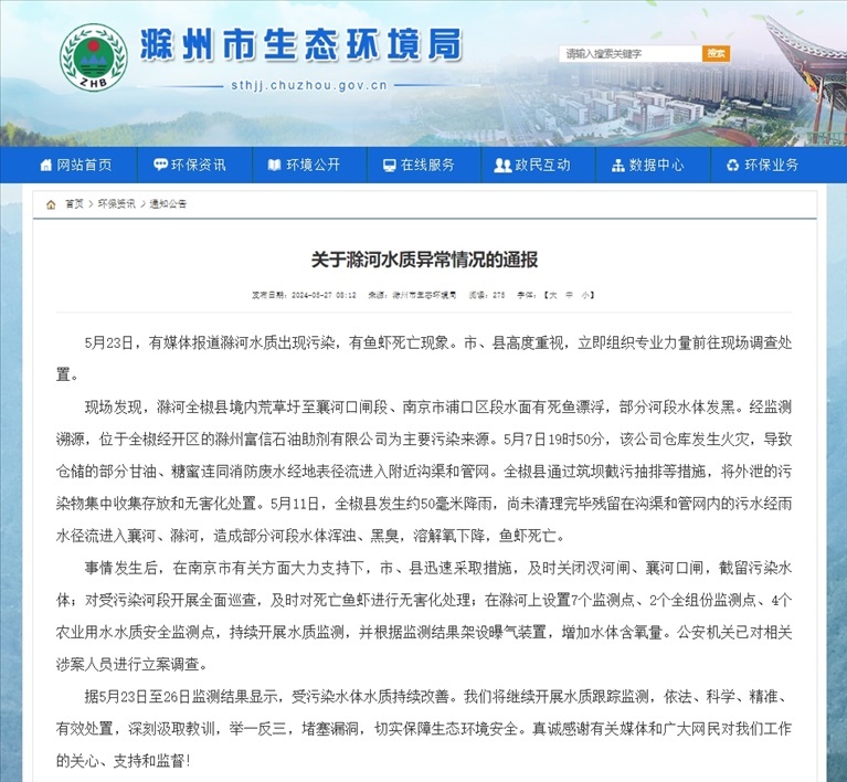 現(xiàn)場(chǎng)發(fā)現(xiàn),滁河全椒縣境內(nèi)荒草圩至襄河口閘段、南京市浦口區(qū)段水面有死魚漂浮,部分河段水體發(fā)黑。經(jīng)監(jiān)測(cè)溯源,位于全椒經(jīng)開區(qū)的滁州富信石油助劑有限公司為主要污染來源。5月7日19時(shí)50分,該公司倉庫發(fā)生火災(zāi),導(dǎo)致倉儲(chǔ)的部分甘油、糖蜜連同消防廢水經(jīng)地表徑流進(jìn)入附近溝渠和管網(wǎng)。全椒縣通過筑壩截污抽排等措施,將外泄的污染物集中收集存放和無害化處置。5月11日,全椒縣發(fā)生約50毫米降雨,尚未清理完畢殘留在溝渠和管網(wǎng)內(nèi)的污水經(jīng)雨水徑流進(jìn)入襄河、滁河,造成部分河段水體渾濁、黑臭,溶解氧下降,魚蝦死亡。公安機(jī)關(guān)已對(duì)相關(guān)涉案人員進(jìn)行立案調(diào)查。