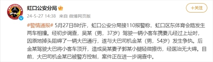 央視網(wǎng)消息:上海市公安局虹口分局發(fā)布警情通報(bào),5月27日8時(shí)許,虹口公安分局接110報(bào)警稱(chēng),虹口區(qū)東體育會(huì)路發(fā)生兩車(chē)相撞。經(jīng)初步調(diào)查,吳某(男,37歲)駕駛一輛小客車(chē)攜妻兒經(jīng)過(guò)上址時(shí),因原地掉頭阻礙了一輛大巴通行,遂與大巴司機(jī)金某(男,54歲)發(fā)生爭(zhēng)執(zhí)。后金某駕駛大巴將小客車(chē)頂開(kāi),造成吳某妻子郭某小腿輕微擦傷,經(jīng)醫(yī)治無(wú)大礙。目前,大巴司機(jī)金某已被警方控制,案件正在進(jìn)一步調(diào)查中。
