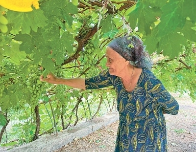 海力其汗·玉素甫正在查看葡萄生長情況。 阿地蘭攝