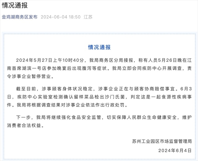 央視網(wǎng)消息:據(jù)蘇州工業(yè)園區(qū)市場監(jiān)督管理局通報,5月27日上午10時40分,商務區(qū)分局接報,稱有人員5月26日晚在江南首席湖濱一號店參加晚宴后出現(xiàn)腹瀉等癥狀。該局立即會同疾防中心開展調(diào)查,責令涉事企業(yè)暫停營業(yè)。