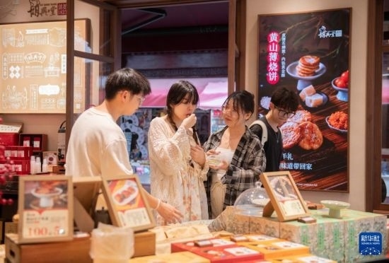 6月28日,在位于黃山市屯溪區(qū)的中國歷史文化名街屯溪老街,游客在一家店鋪試吃黃山特色小吃。