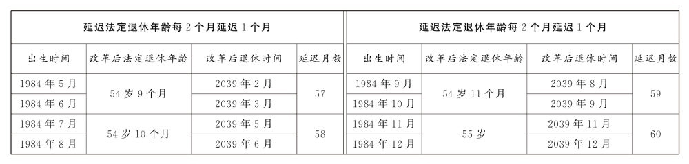 第一條 從2025年1月1日起,男職工和原法定退休年齡為五十五周歲的女職工,法定退休年齡每四個月延遲一個月,分別逐步延遲至六十三周歲和五十八周歲;原法定退休年齡為五十周歲的女職工,法定退休年齡每二個月延遲一個月,逐步延遲至五十五周歲。國家另有規(guī)定的,從其規(guī)定。