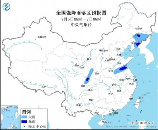 全國強降水落區(qū)預報(7月6日08時-7日08時) 圖源:中央氣象臺網(wǎng)站