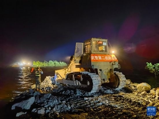 7月7日凌晨,在湖南省岳陽(yáng)市華容縣團(tuán)洲垸洞庭湖一線堤防決口處,武警部隊(duì)官兵操縱工程機(jī)械封堵決口。