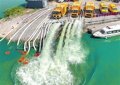 在浙江省臺(tái)州市防汛防臺(tái)綜合應(yīng)急演練中,市政強(qiáng)排車(chē)進(jìn)行作業(yè)。孫金標(biāo)攝(人民圖片)