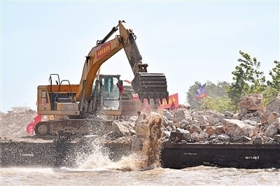 在湖南省岳陽(yáng)市華容縣團(tuán)洲垸洞庭湖大堤決口現(xiàn)場(chǎng),搶險(xiǎn)隊(duì)伍在進(jìn)行堵口作業(yè)。新華社記者 陳振海攝