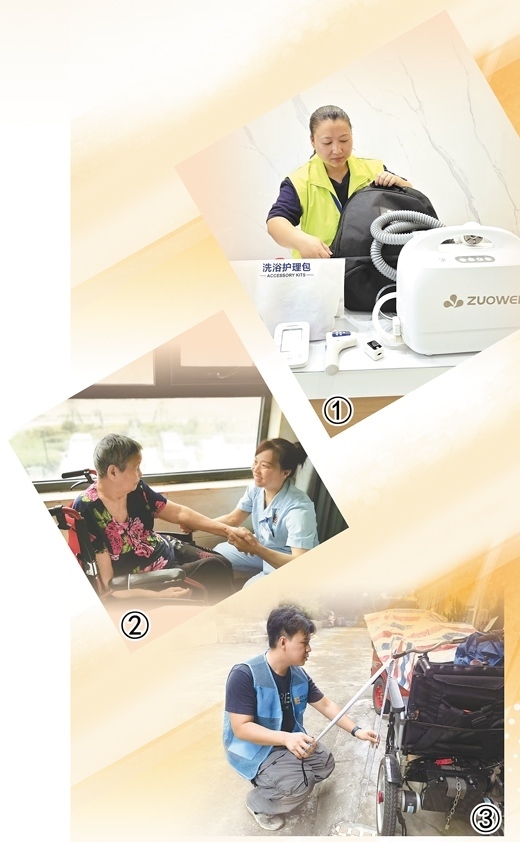 圖①:老年助浴員肖琳在店里收拾設(shè)備,準(zhǔn)備上門為老人助浴。冷智梅攝 圖②:健康照護(hù)師劉馳在為耿守愛老人進(jìn)行護(hù)理。本報(bào)記者 朱佩嫻攝 圖③:適老化改造評估師鐘晉軒在測量曾炳成老人的輪椅扶手高度。本報(bào)記者 洪秋婷攝