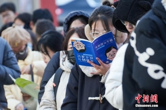 2023年11月26日,山西省太原市,考生在考場外復習。當日,中央機關及其直屬機構2024年度考試錄用公務員公共科目筆試舉行。中新社記者 武俊杰 攝