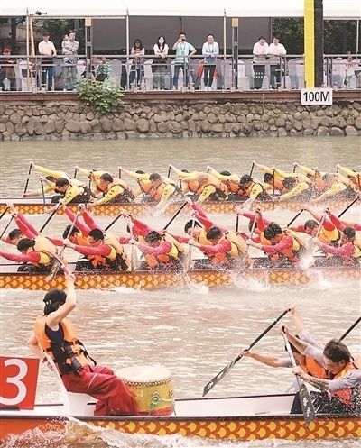 6月1日,第二十屆上海蘇州河城市龍舟邀請賽比賽現場,選手在激烈比拼。馬偉勤攝(人民視覺)