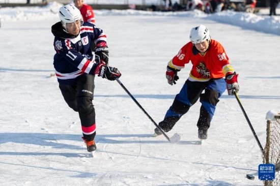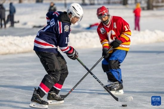 1月18日,人們在哈爾濱市丁香公園內打冰球。