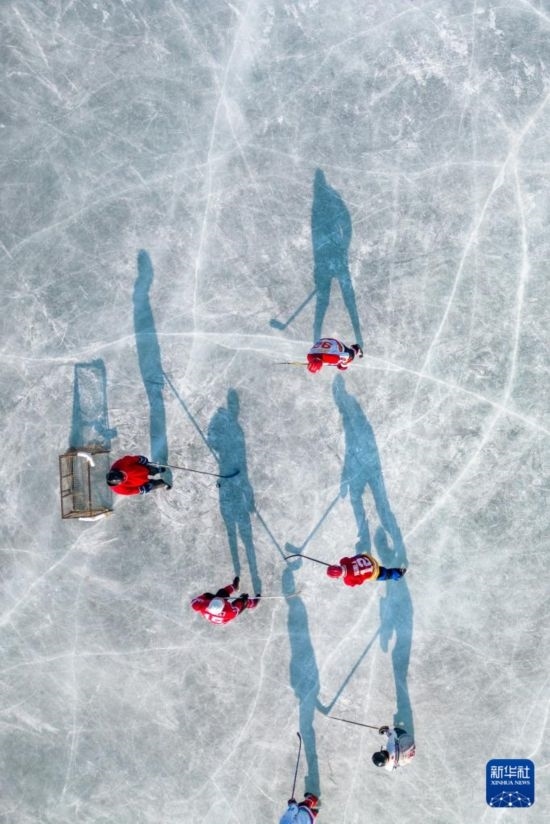 1月18日,人們在哈爾濱市丁香公園內打冰球(無人機照片)。