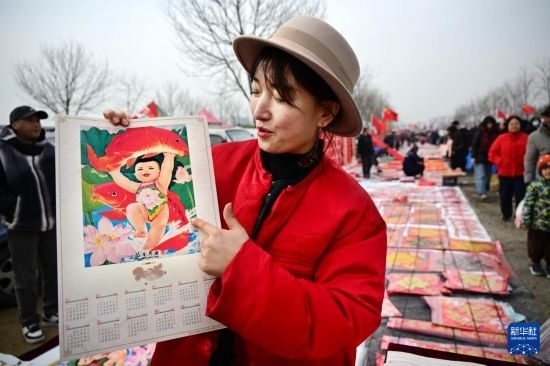 1月18日,一名攤主在泊里大集上推銷(xiāo)傳統(tǒng)年畫(huà)。