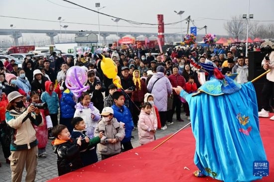 1月18日,人們?cè)诓蠢锎蠹嫌^看表演。