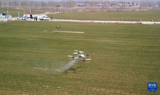 2月27日,植保無(wú)人機(jī)在山東省新泰市禹村鎮(zhèn)作業(yè)(無(wú)人機(jī)照片)。
