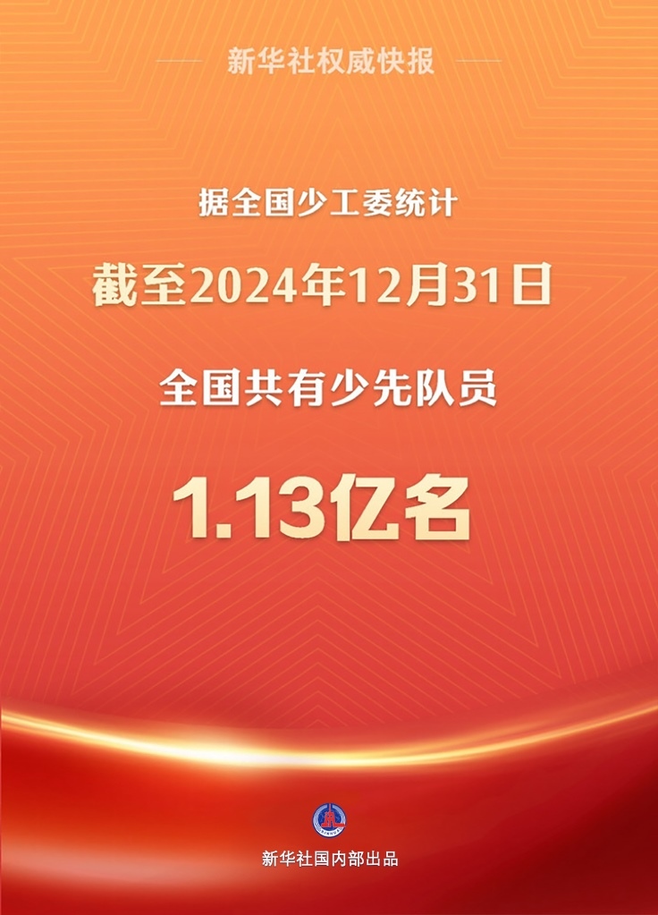 新華社北京5月31日電 記者31日從共青團中央獲悉,據(jù)全國少工委統(tǒng)計,截至2024年12月31日,全國共有少先隊員1.13億名,中小學校少先隊大、中隊輔導員305.4萬名。中小學校少工委17.6萬個、少先隊大隊17.9萬個、中隊287.4萬個。